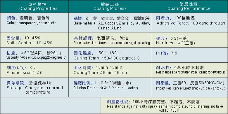 This water-borne varnish is widely used for its high-performance. With water for the diluents, it has great adhesive force and great re-coating property. Being Non-burning, non-burst, non-poisonous, it is pollution-free. It is hard and flexible, with high performance of aging resistance, abrasion resistance, and salt spray resistance.