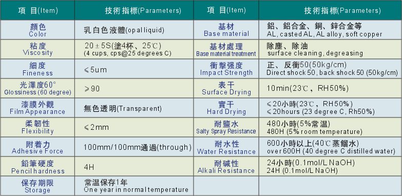 The varnish has a great adhesive force, anti-oxygen and anti-corrosion for metals and the plating. It cures the plating and gives a surface-clear, gloss and anti-friction protection layer. This layer is tough and resists water, acid and alkali. Diluting by water, and with minor smell, it is safe, green and easy to use. By using this product, the plating will have a high gloss, good fullness and great resistance to water, salt, acid, alkali, sweat, and weather, providing outstanding anti-corrosion function.