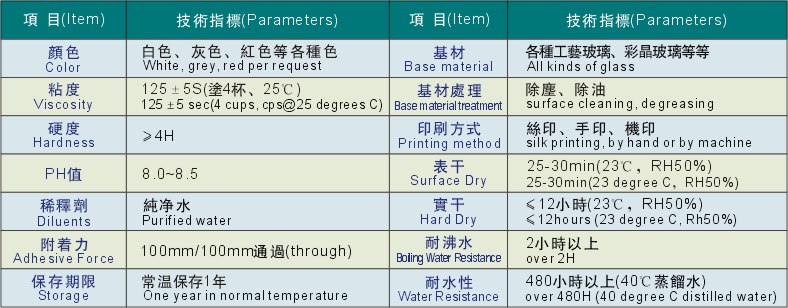 It is widely used in silk printings for glass wine bottle, glass cups, perfume bottles, cosmetic containers, glass utensils and Xmas glass products.